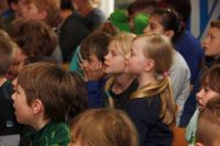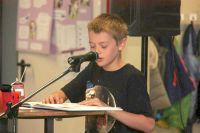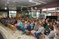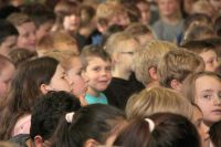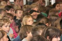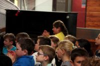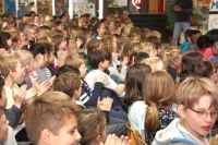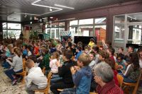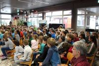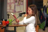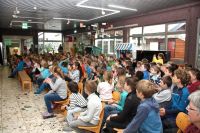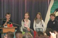 Beim heutigen Vorleseentscheid der Grundschule Kuhstraße traten jeweils ein Junge und ein Mädchen und ein Junge aus der 4a und der 4b bei einer Vollversammlung in der Aula gegeneinander an und lasen jeweils drei Minuten aus ihrem selbst gewählten Buch vor.